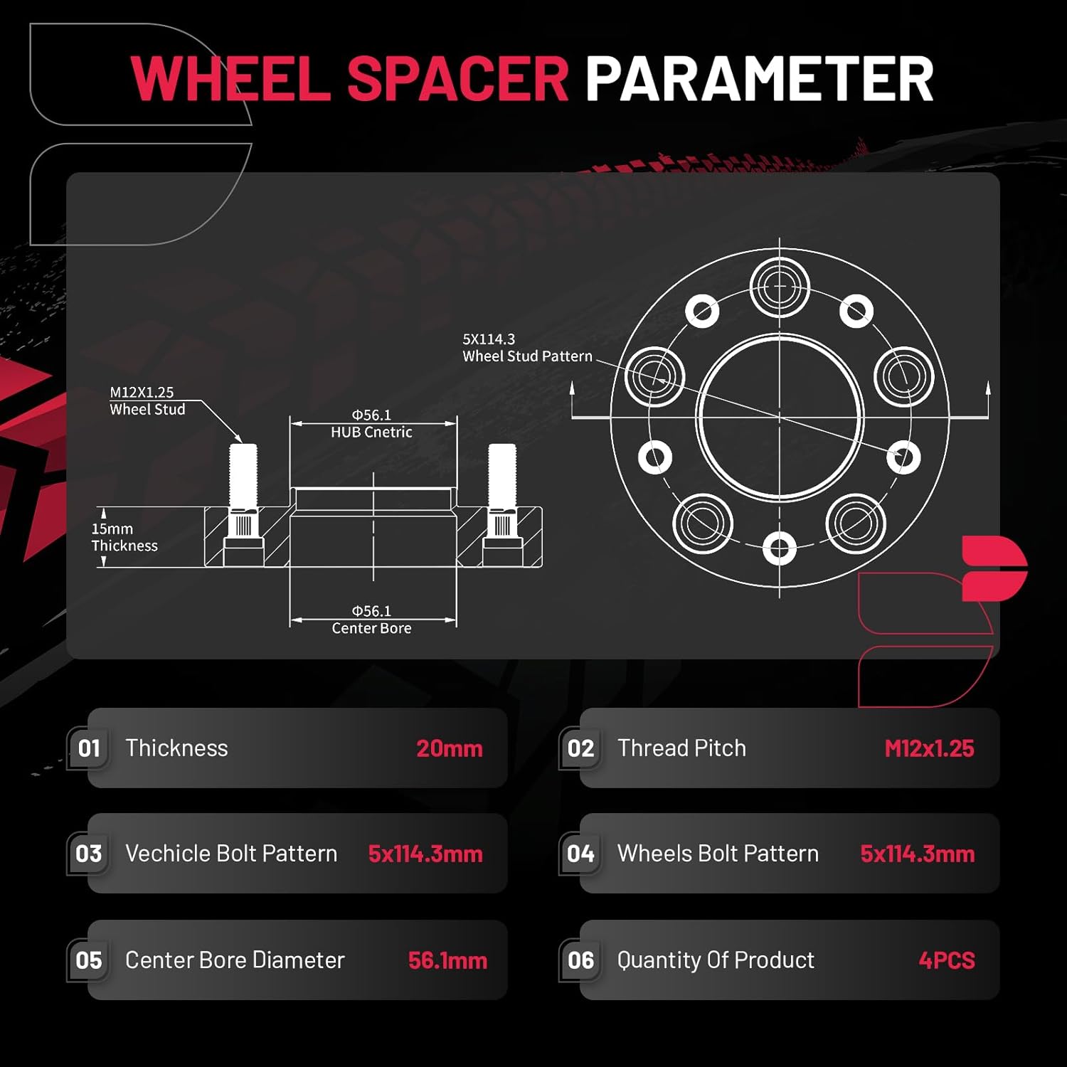 【Product Specs:】Set of 4 0.59inch/15MM Thickness | 5x114.3mm Wheel Bolt attern | 56.1mm Center Bore | M12x1.25 Thread Pitch | Protective gloves| Cleaning wire balls.