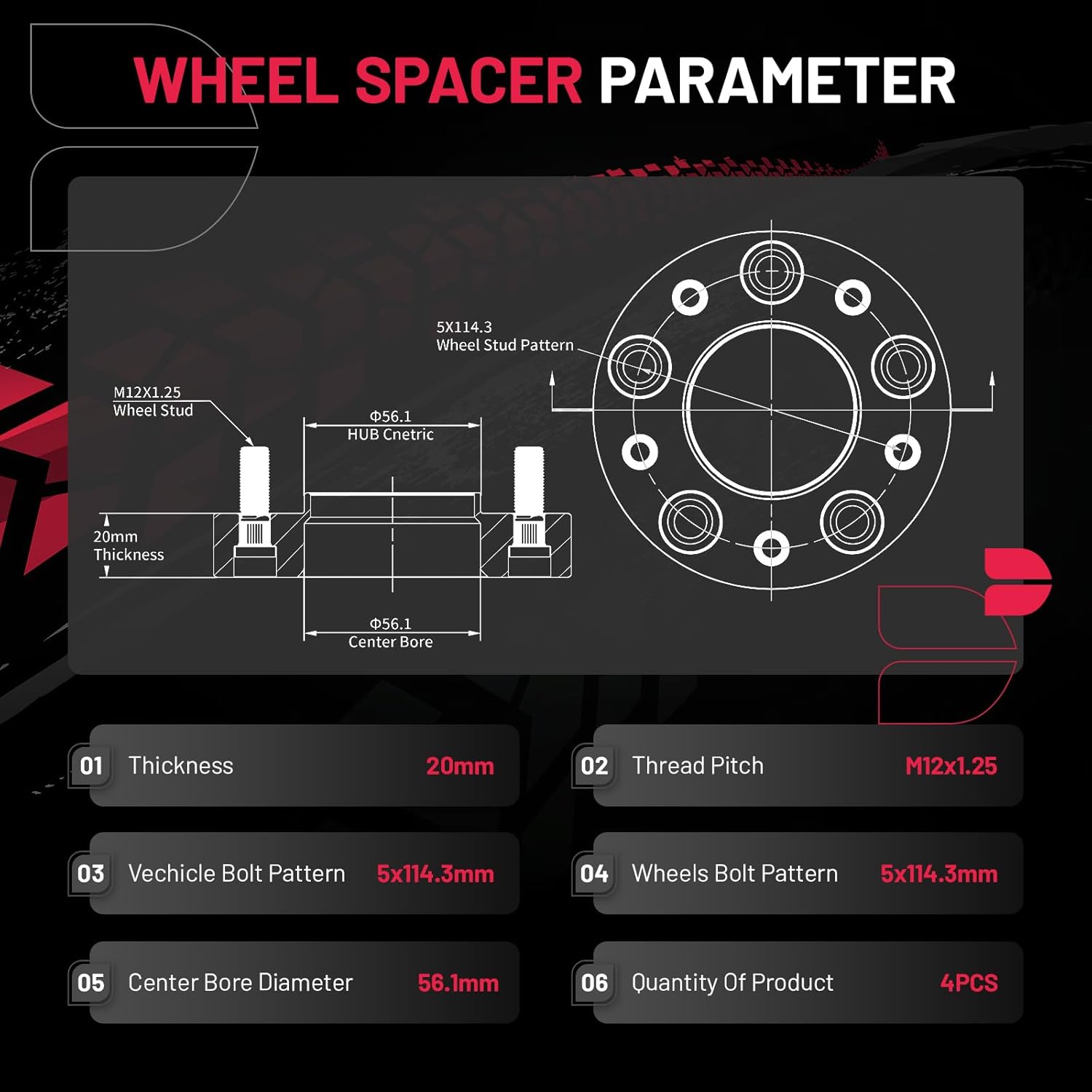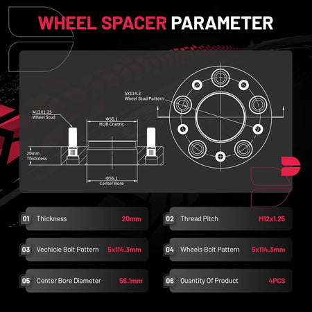 【Product Specs:】Set of 4 0.78inch/20MM Thickness | 5x114.3mm Wheel Bolt attern | 56.1mm Center Bore | M12x1.25 Thread Pitch | Protective gloves| Cleaning wire balls.
