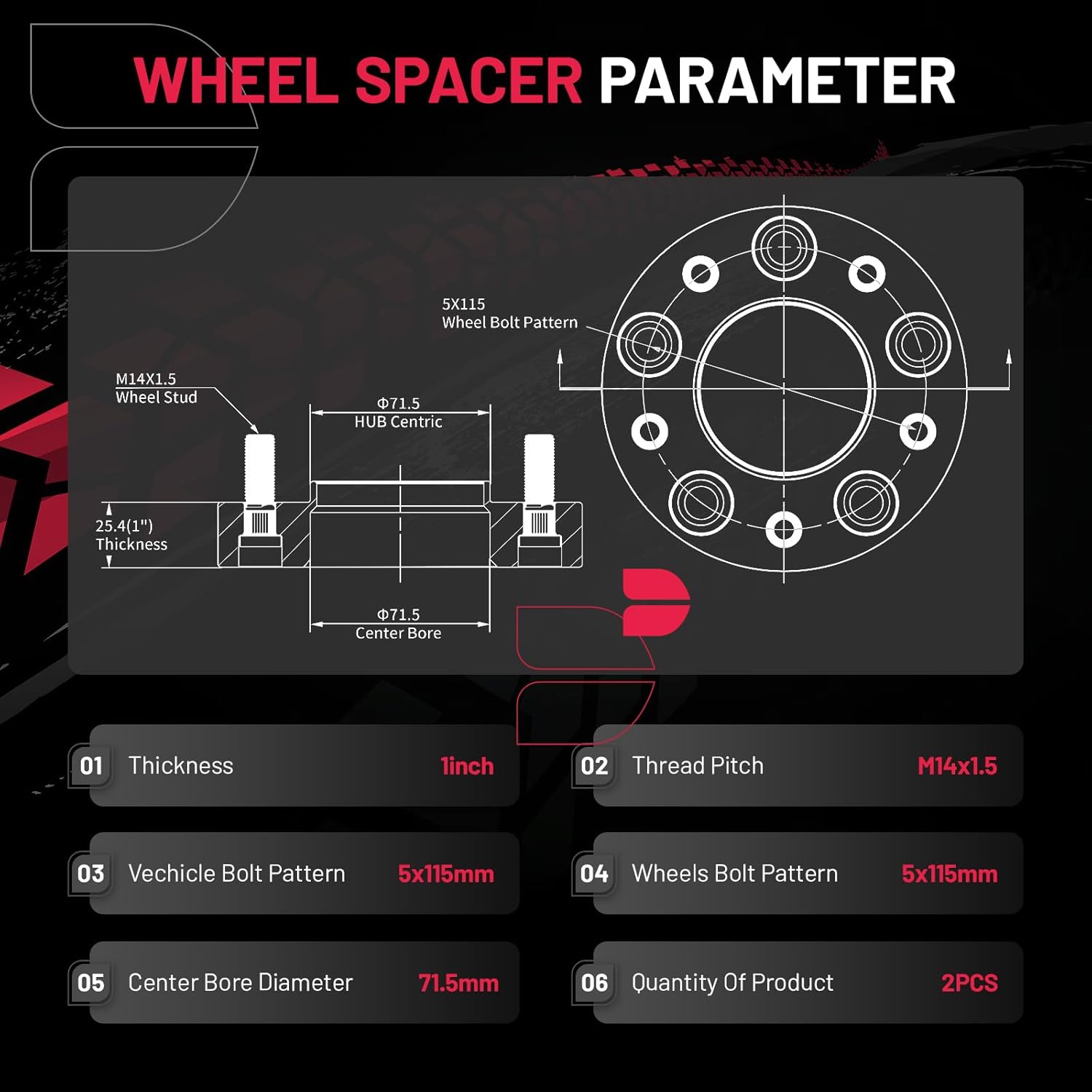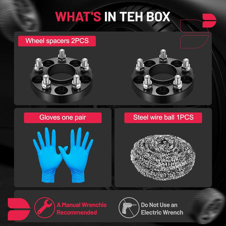 【Product Specs:】Set of 2 1 inch/25.4 mm Thickness | 5x115mm Wheel Bolt attern | 71.5mm Center Bore | M14x1.5 Thread Pitch | Protective gloves| Cleaning wire balls.