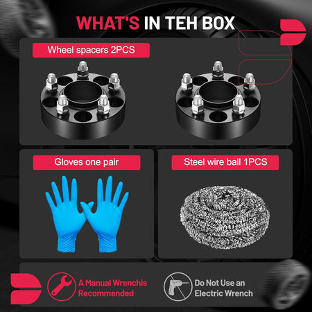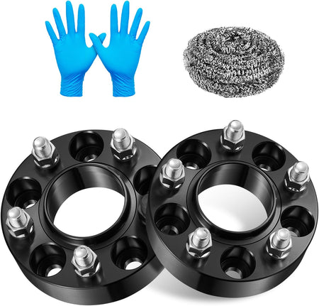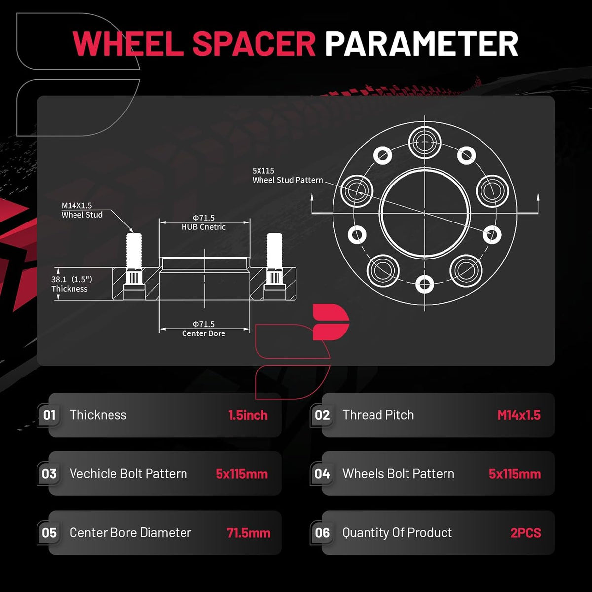 【Product Specs:】Set of 2 1.5inch/38.1MM Thickness | 5x115mm Wheel Bolt attern | 71.5mm Center Bore | M14x1.5 Thread Pitch | Protective gloves| Cleaning wire balls.