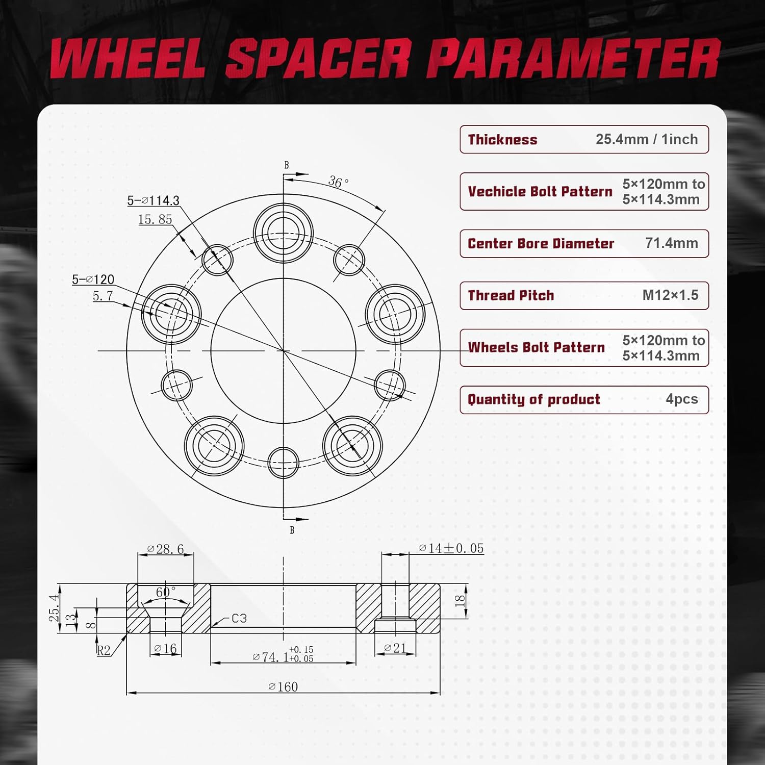Product Specs: Set of 4 1 inch/25.4 mm Thickness, 5x120.65mm Vehicle Bolt Pattern, 5x114.3mm Wheel Bolt Pattern, 74.1mm Center Bore, M12x1.5 Thread Pitch (without lip hub). Protective gloves, Cleaning wire balls