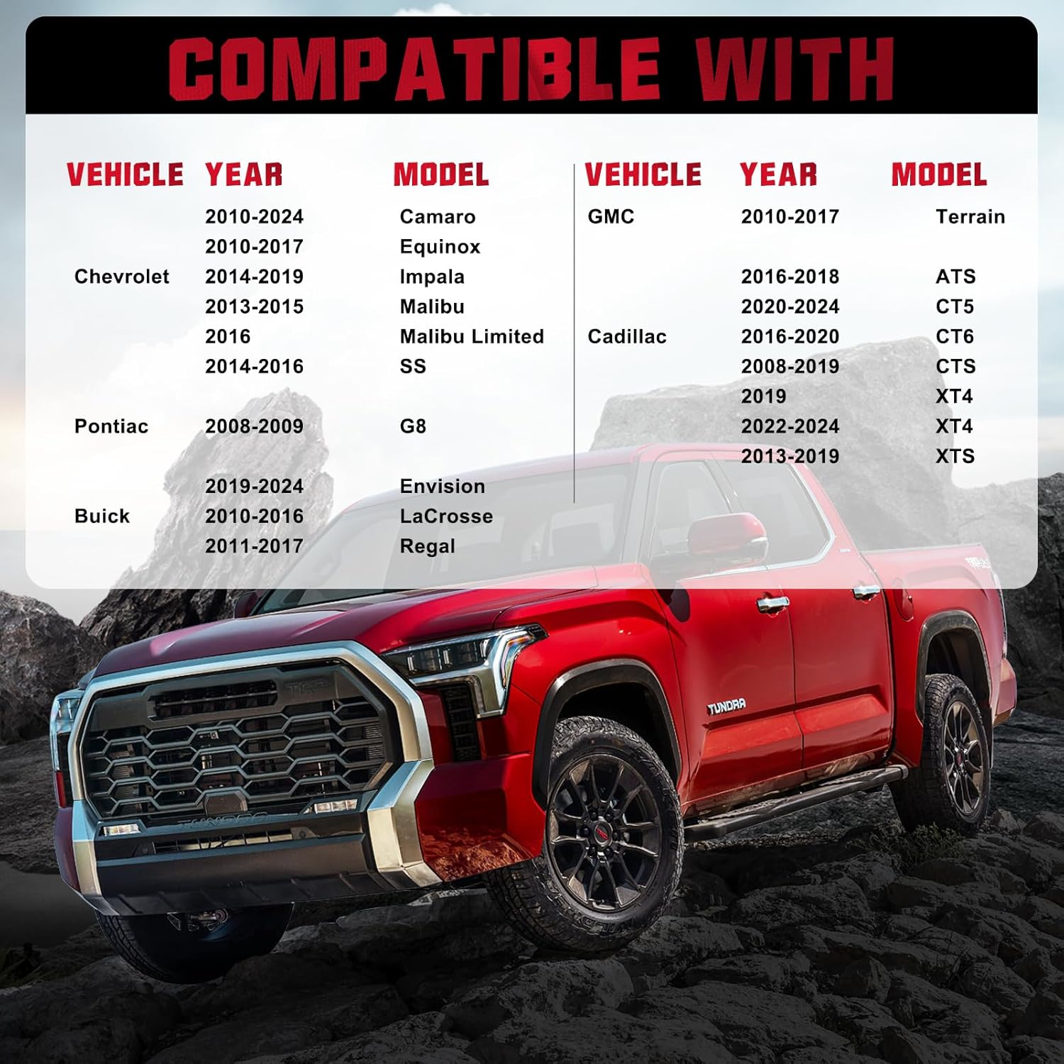 Basic Info: Wheel Spacers Compatible with Buick (Envision LaCrosse Regal), Compatible with Cadillac (ATS CT5 CT6 CTS XT4 XTS), Compatible with Chevy Camaro (Equinox Impala Malibu Malibu Limited SS), Compatible with GMC Terrain, Compatible with Pontiac G8. Please check detail fitting info from pics or detail page. 12 months warranty and lifetime after-sales service are furnished after bought our products. Please choose a suitable one with confidence