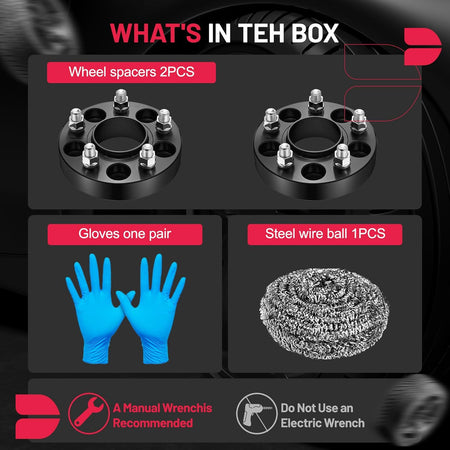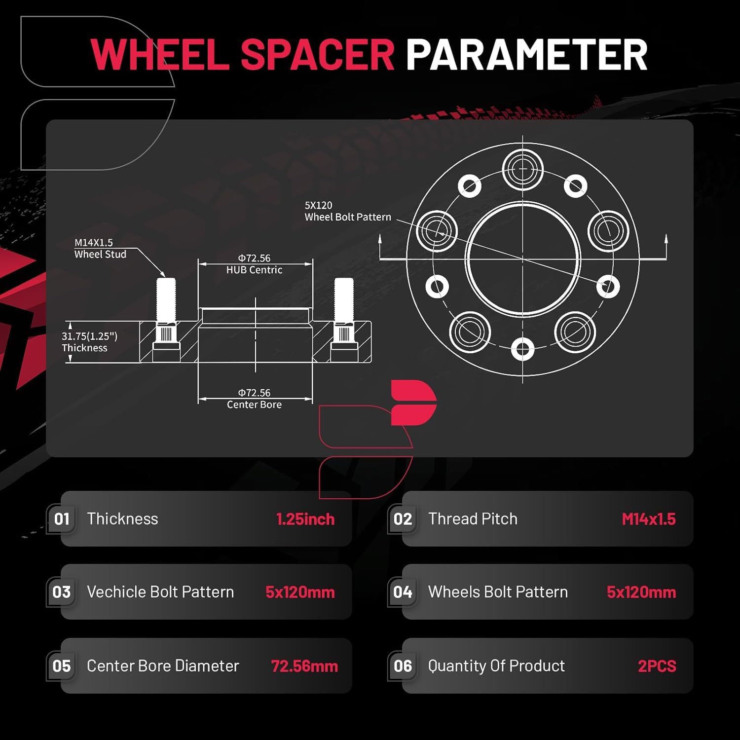 【Product Specs:】Set of 2 1.25 inch/31.75 mm Thickness | 5x120mm Wheel Bolt attern | 72.56mm Center Bore | M14x1.5 Thread Pitch | Protective gloves| Cleaning wire balls.