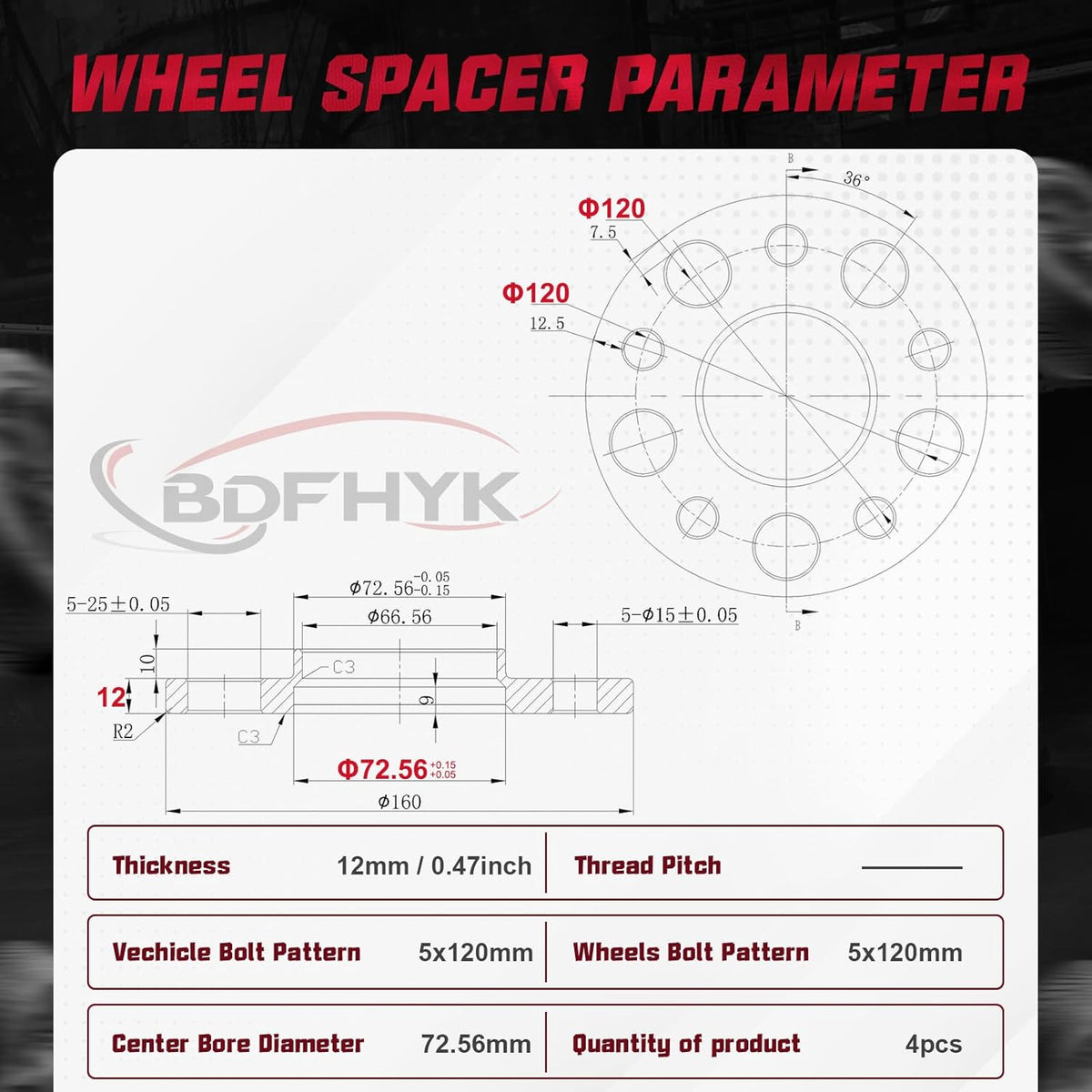 【Product Specs:】Set of 2 0.47 inch/12 mm Thickness | 5x120mm Wheel Bolt Pattern | 72.56mm Center Bore | M12*1.5 Thread Pitch | Protective gloves| Cleaning wire balls.