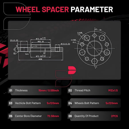 【Product Specs】:Set of 2 0.59 inch/15 mm Thickness | 5x120mm Wheel Bolt Pattern | 72.56mm Center Bore | M12*1.25 Thread Pitch | Protective gloves| Cleaning wire balls.