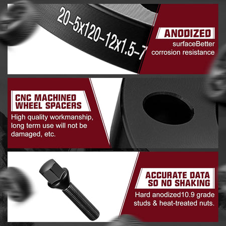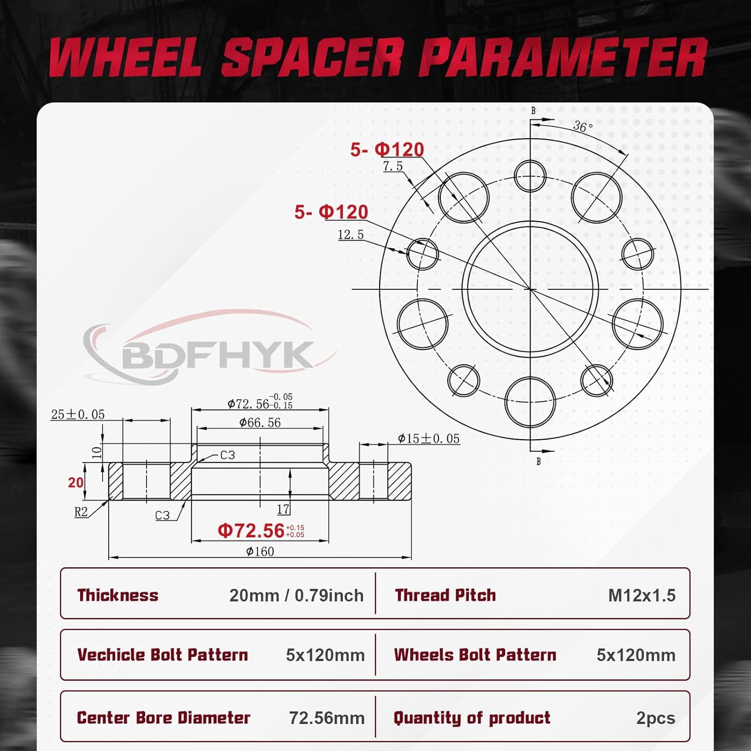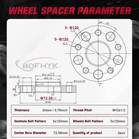 Product Specs: Set of 2 0.79 inch/20 mm Thickness | 5x120mm Wheel Bolt Pattern | 72.56mm Center Bore | M12*1.5 Thread Pitch | Protective gloves| Cleaning wire balls