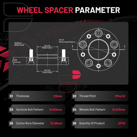 【Product Specs:】Set of 2 0.78inch/20MM Thickness | 5x120mm Wheel Bolt attern | 72.56mm Center Bore | M14x1.5 Thread Pitch | Protective gloves| Cleaning wire balls.
