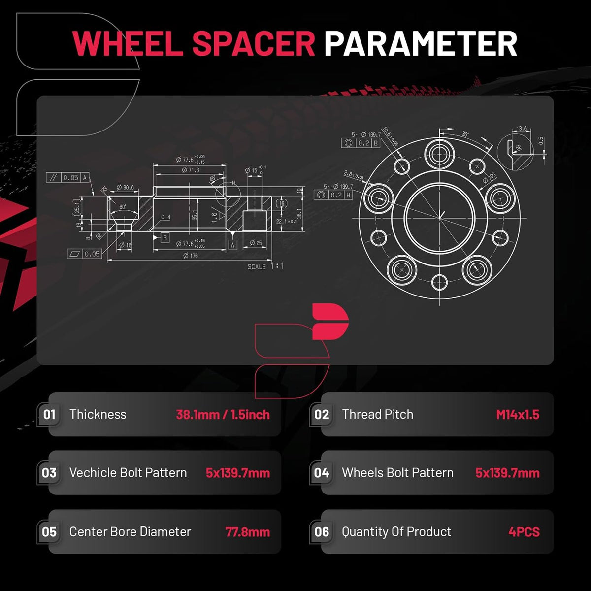 Product Specs: Set of 4 1.5 inch/38.1 mm Thickness | 5x139.7mm Wheel Bolt Pattern | 77.8mm Center Bore | M14x1.5 Thread Pitch | Protective gloves| Cleaning wire balls