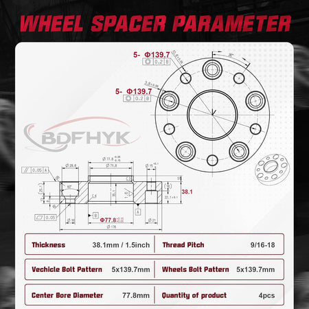 【Product Specs】:Set of 4 1.5 inch/38.1 mm Thickness | 5x139.7mm Wheel Bolt Pattern | 77.8mm Center Bore | 9/16-18 Thread Pitch | Protective gloves| Cleaning wire balls.