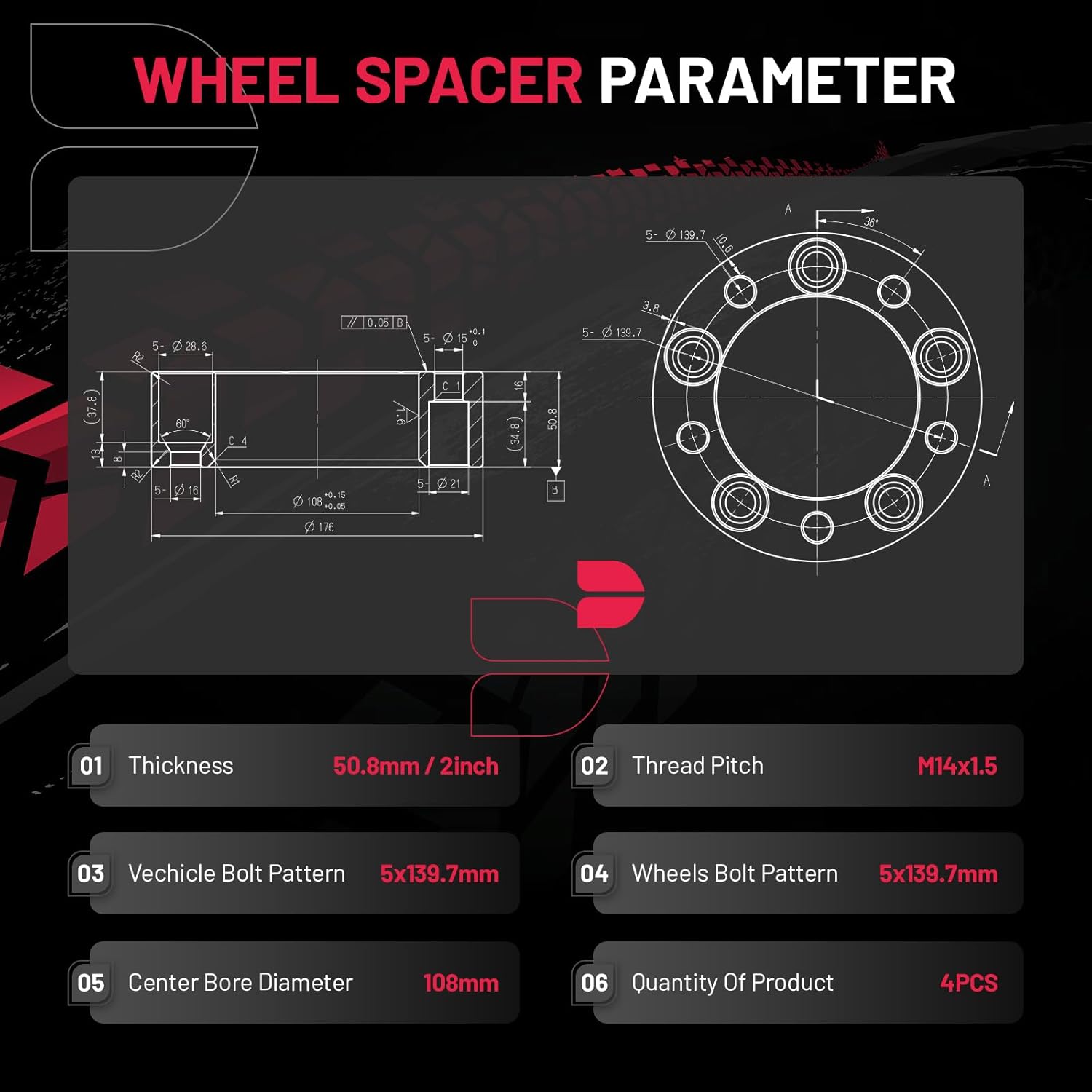 Product Specs: Set of 4 2 inch/50.8mm Thickness, 5x139.7mm Wheel Bolt Pattern, 108mm Center Bore, M14*1.5 Thread Pitch (without lip hub), Protective gloves, Cleaning wire balls