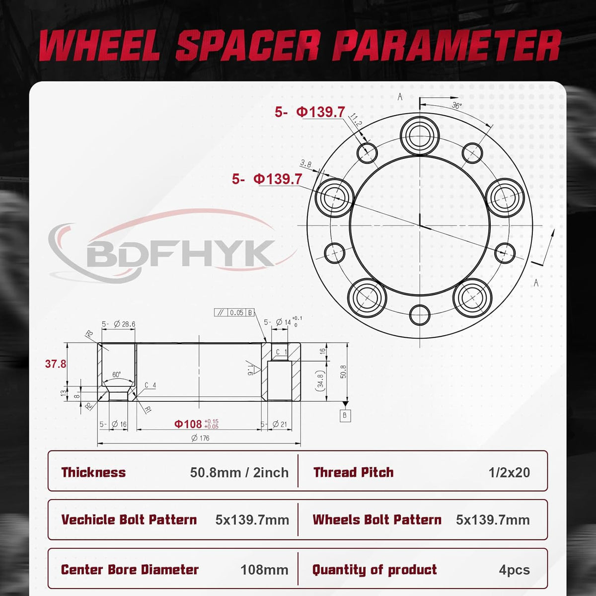 【Product Specs】:Set of 4 50.8mm / 2inch Thickness | 5x139.7mm Wheel Bolt Pattern | 108mm Center Bore | 1/2*20 Thread Pitch | Protective gloves| Cleaning wire balls.