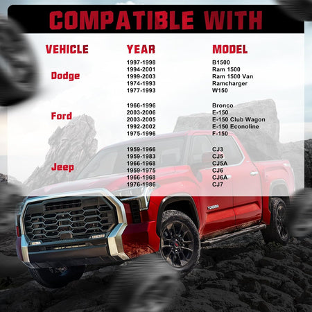 【Basic Info】:Wheel Spacers Compatible with Dodge 1994-2001 Ram 1500,1997-1998 B1500,1977-1993 W150,1974-1993 Ramcharger, 1966-1996 Bronco,2003-2006 E-150,1975-1996 F-150,2003-2005 E-150 Club Wagon;Compatible with Jeep 1959-1966 CJ3,1959-1983 CJ5,1966-1968 CJ5A,1959-1975 CJ6,1966-1968 CJ6A,1976-1986 CJ7.Please check detail fitting info from pics or detail page.12 months warranty and lifetime after-sales service are furnished after bought our products. Please choose a suitable one with confidence.