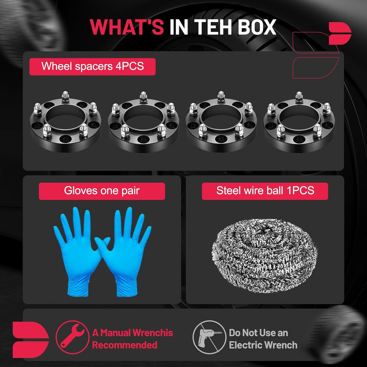 【Product Specs:】Set of 4 1.25 inch/31.75 mm Thickness | 5x150mm Wheel Bolt attern | 110mm Center Bore | M14x1.5 Thread Pitch | Protective gloves| Cleaning wire balls.