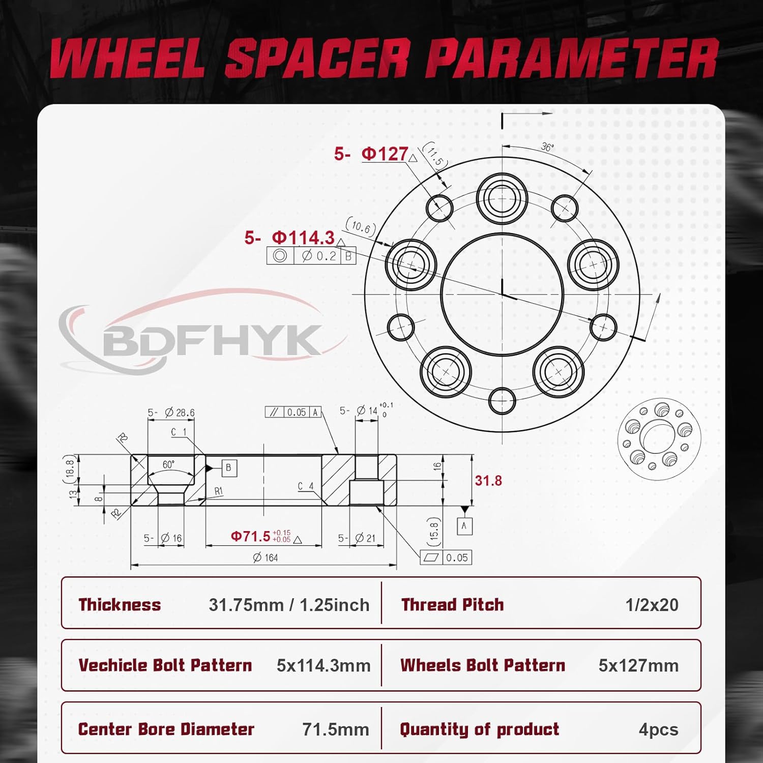 【Product Specs】:Set of 4 1 inch/25.4 mm Thickness | 5x114.3mm Vehicle Bolt Pattern| 5x127mm Wheel Bolt Pattern | 71.5mm Center Bore | 1/2*20 Thread Pitch | Protective gloves| Cleaning wire balls.