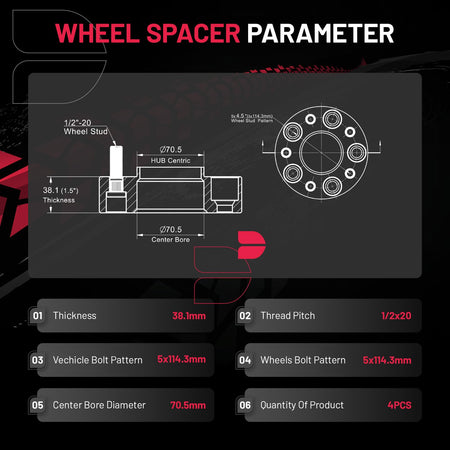 - 【Product Specs:】1.5 inch/38 mm Thickness | 5x114.3 mm Wheel Bolt Pattern | 70.5 mm Center Bore | 1/2*20 Thread Pitch | Protective gloves| Cleaning wire balls.