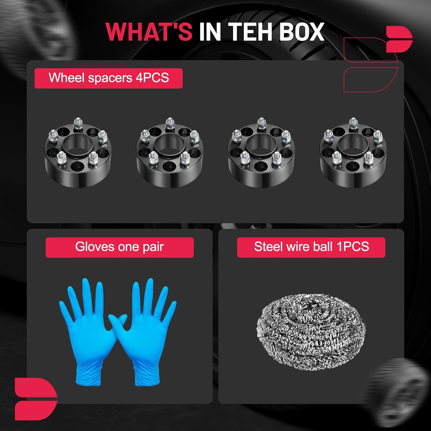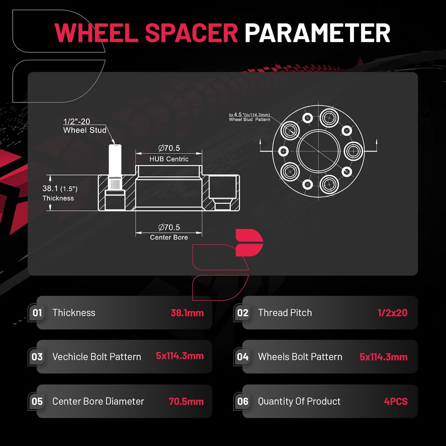 Product Specs: 1.5 inch/38 mm Thickness | 5x114.3 mm Wheel Bolt Pattern | 70.5 mm Center Bore | 1/2*20 Thread Pitch | Protective gloves| Cleaning wire balls