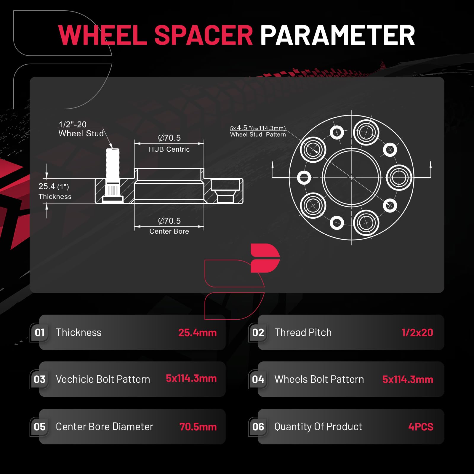 - 【Product Specs:】1 inch/25 mm Thickness | 5x114.3 mm Wheel Bolt Pattern | 70.5 mm Center Bore | 1/2*20 Thread Pitch | Protective gloves| Cleaning wire balls.
