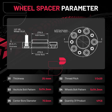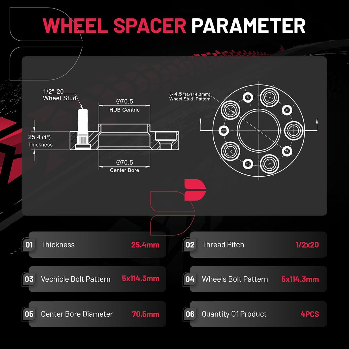 Product Specs: 1 inch/25 mm Thickness | 5x114.3 mm Wheel Bolt Pattern | 70.5 mm Center Bore | 1/2*20 Thread Pitch | Protective gloves| Cleaning wire balls