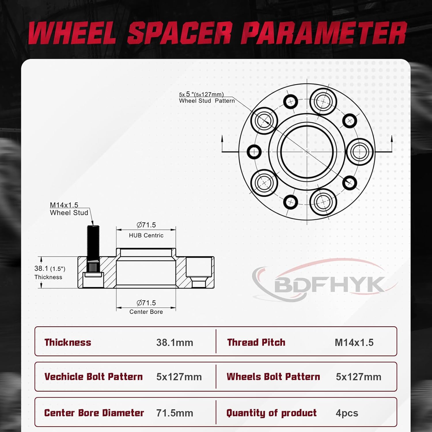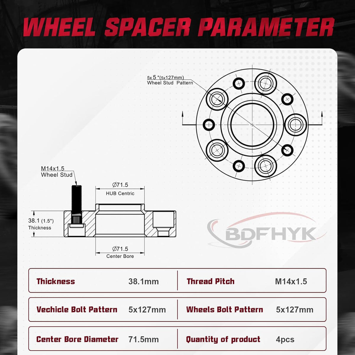 BDFHYK 5x5 Wheel Spacers 1.5 Inch Compatible with Jeep Grand Cherokee L Wrangler Compatible with Dodge Durango 2011-2024, 4PCS 5x127mm Wheel Spacer for M14x1.5 Studs & 71.5mm Hub Bore, Not Hubcentric