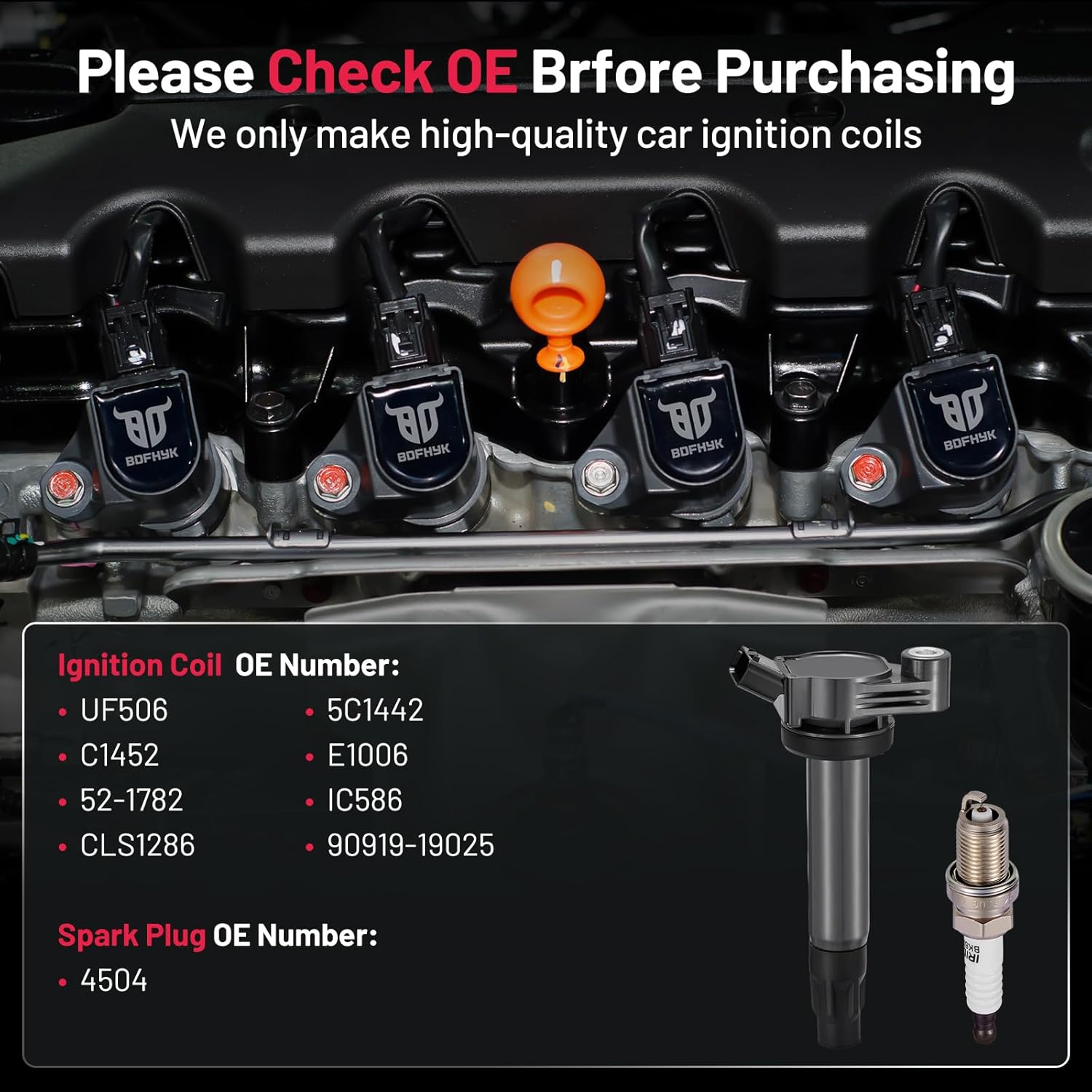 【Yes, you need a new coil and spark plug!】If your car has been used for a long time(over 80000km) and has problems like car shaking, start-up failure, speeding up slowly, and increasing fuel consumption, you may need to change a new set of spark plugs and coil packs. BDFHYK ignition coil packs and spark plugs can offer you a professional user experience and make your car like new. You may choose it with confidence.