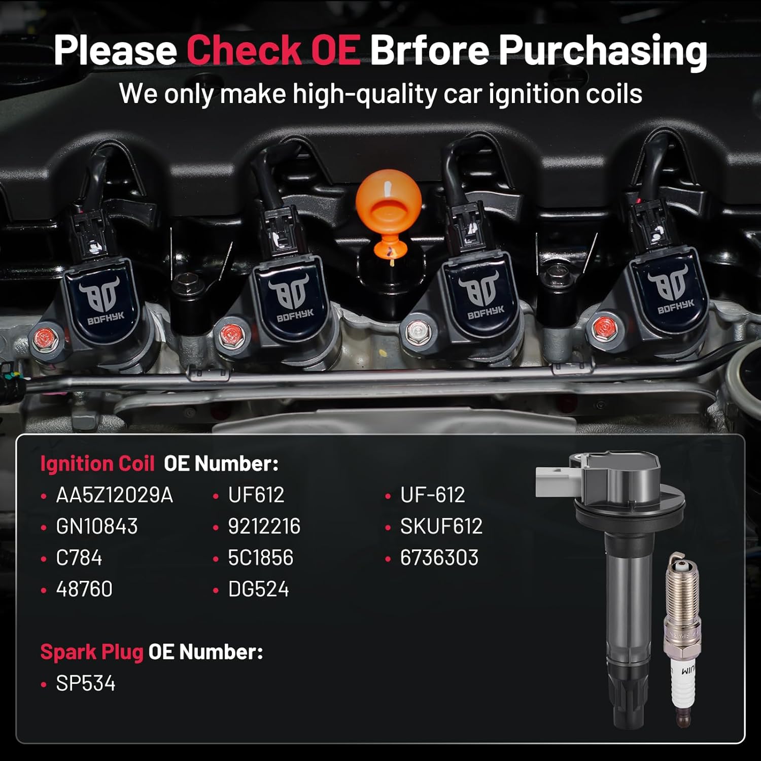 【Features of ignition coil:】High quality ignition coils are made of silicon steel material, Japan-imported rubber, and Germany-imported varnished wire, which makes our coils have a long using life and better quality. ‼Please check OE:AA5Z12029A UF612 UF-612 GN10843 9212216 SKUF612 C784 5C1856 6736303 48760 DG524.
