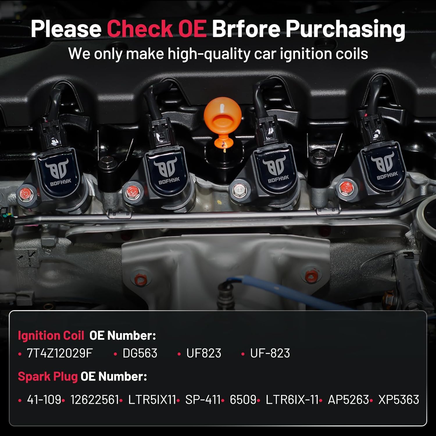 【Features of ignition coil:】High quality ignition coils are made of silicon steel material, Japan-imported rubber, and Germany-imported varnished wire, which makes our coils have a long using life and better quality. ‼Please check OE:7T4Z12029F DG563 UF823 UF-823.