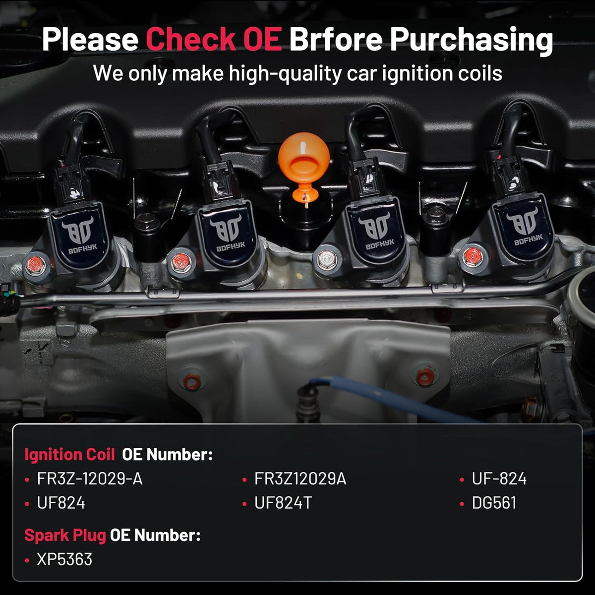 - OE Number Ignition coil Replace# FR3Z-12029-A, FR3Z12029A, UF-824, UF824, UF824T, DG561; Spark plug Replace#XP5363