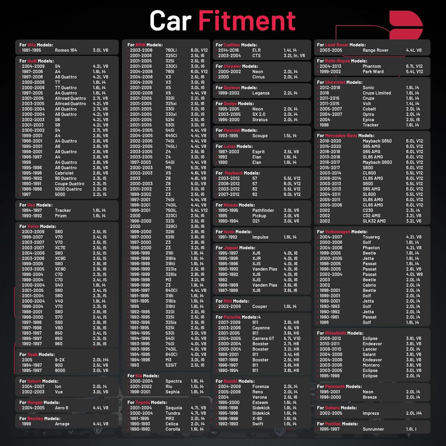 【Compatibility Information】:Spark Plug 6418 Compatible with BMW 320i 323i 325Ci 328is 330xi 525iT, 528i, 530i, M3, X3, X5, Z3, Z4; Compatible with Mercedes-Benz C32 AMG, SLK32 AMG; Compatible with Audi A4, A4 Quattro, A6, A6 Quattro, Allroad Quattro S4 ; Compatible with Cadillac CTS; Compatible with Chevy Epica; Compatible with Mitsubishi Eclipse, Endeavor, Galant, Montero; Compatible with Jaguar Vanden Plas, XJ6, XJR, XJS.Please see images or details page for complete Compatibility information.