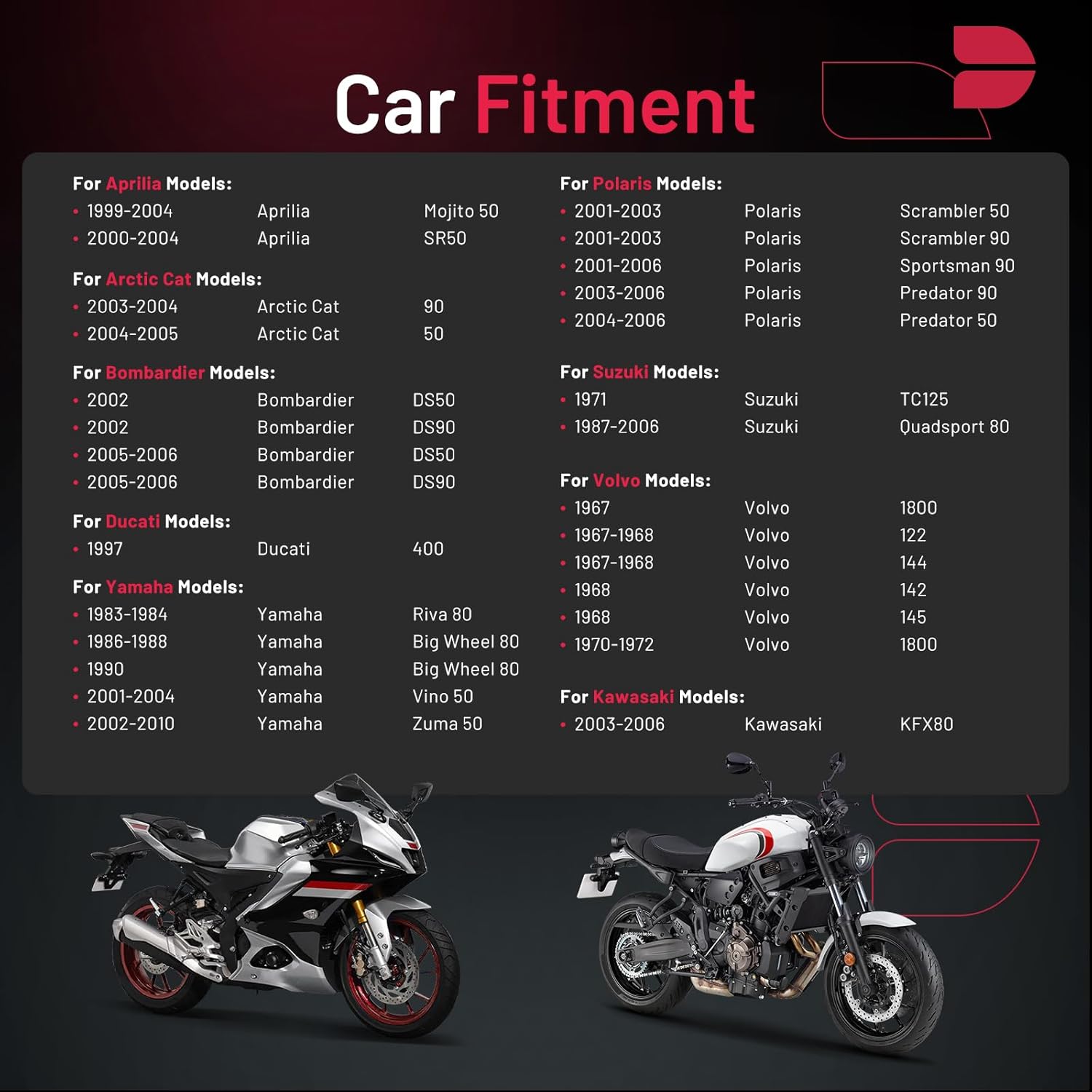 【Compatibility Information】:Universal Spark Plug 6422 Compatible with Aprilia Mojito 50 SR50; Compatible with Arctic Cat 50 90; Compatible with Bombardier DS50 DS90; Compatible with Ducati 400; Compatible with Kawasaki KFX80; Compatible with Polaris Predator 50 90 Scrambler 50 90 Sportsman 90; Compatible with Suzuki Quadsport 80 TC125; Compatible with Yamaha Big Wheel 80 Riva 80 Vino 50 Zuma 50.Please see images or details page for complete Compatibility information