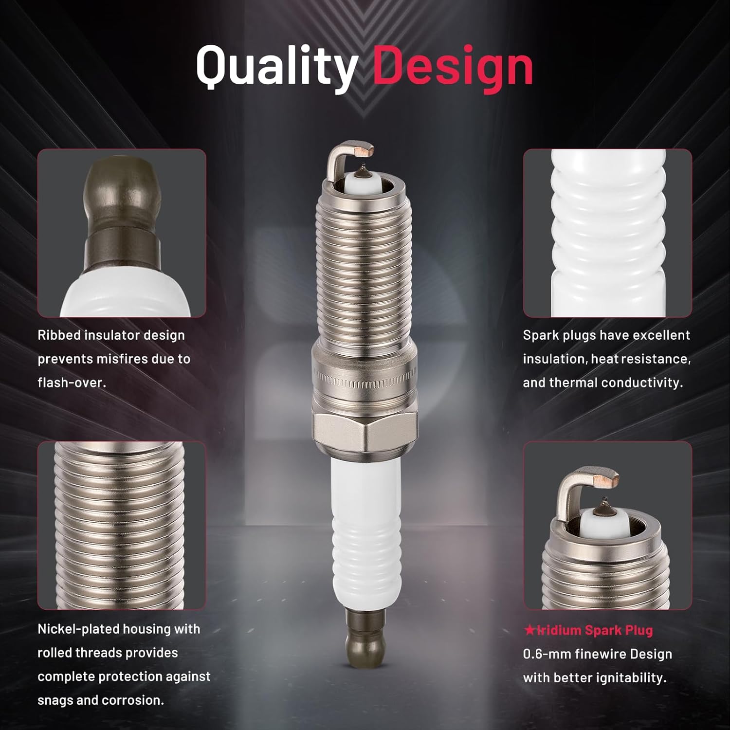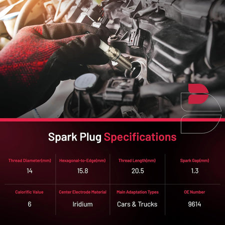 【Spark plug specification】:(1)Center Electrode Material:Iridium.(2)Thread Diameter:14mm.(3)Hexagonal-to-Edge Size:15.8mm.(4)Thread Length:25mm.(5)Spark Gap:1.3mm.(6)Calorific Value:5