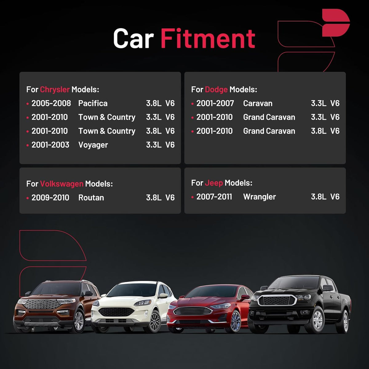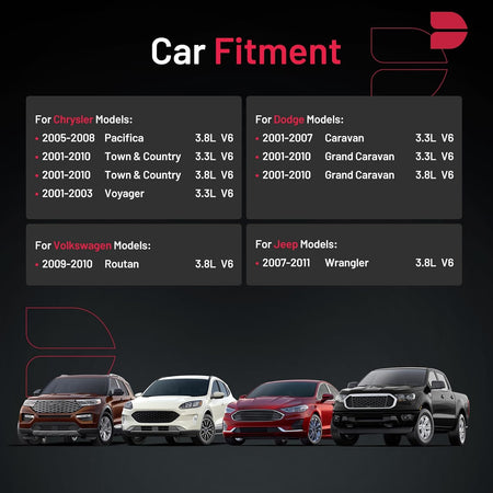 【Compatibility Information】:Spark Plug 6720 Compatible with Chrysler 2005-2008 Pacifica,2001-2010 Town & Country,2001-2003 Voyager; Compatible with Dodge 2001-2007 Caravan,2001-2010 Grand Caravan; Compatible with Jeep 2007-2011 Wrangler; Compatible with Volkswagen 2009-2010 Routan.Please see images or details page for complete Compatibility information