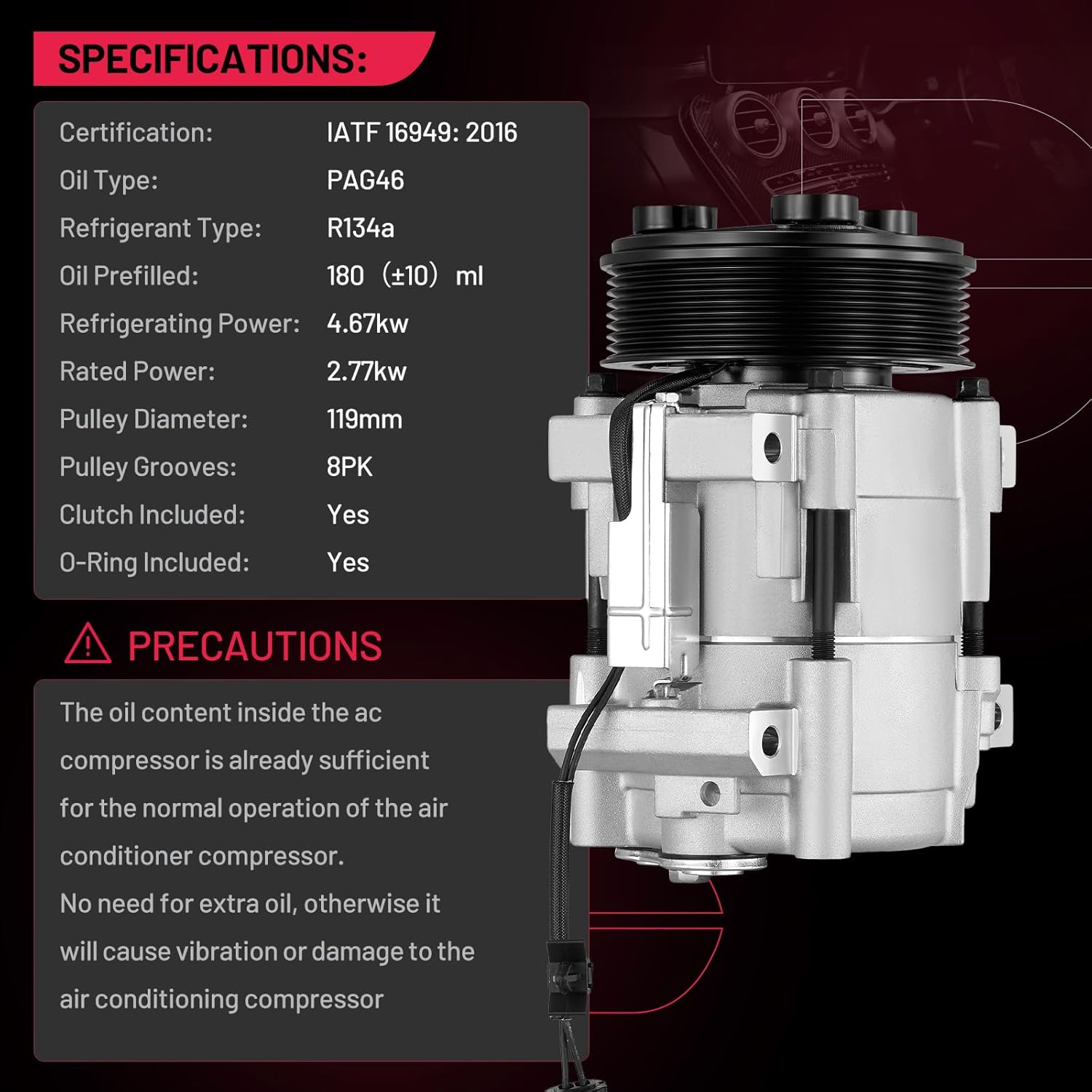 Superior Quality - The A/C Compressors for car are built in a IATF 16949:2016 Certified facility, meet or exceed OE specifications. Mechanically tested prior to leaving the factory ensures optimal performance and enhanced durability. Great life cycles.