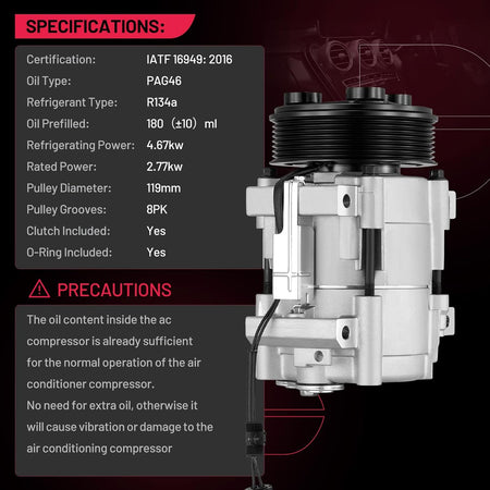 Easy Installation - The Air Conditioning A/C Compressors come pre-charged with PAG oil for R134a applications, come with the R134A required o-rings /sealing washers and direct fit connectors for ease of installation