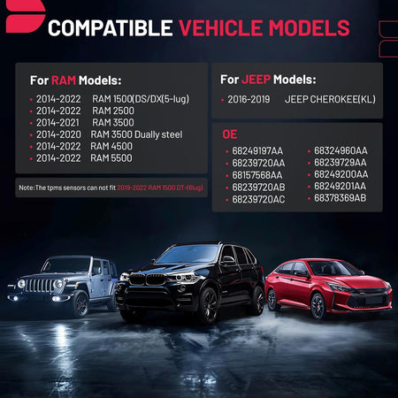Fitment: This 100% brand new TPMS Sensor compatible with JEEP CHEROKEE(KL) 2016-2019, 2014-2022 RAM 1500(DS DX(5-lug), 2014-2022 RAM 2500, 2014-2021 RAM 3500, 2014-2022 RAM 4500, 2014-2022 RAM 5500 (Note:The tpms sensors can not fit 2019-2022 RAM 1500 DT-(6lug)