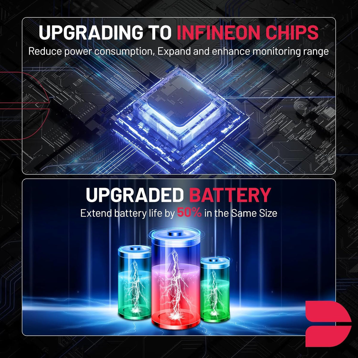 Perfect Performance: This brand new tire pressure monitor system (TPMS) is equipped with infineon chips and a high-capacity battery, ensuring a strong signal, real-time monitoring, and a long lifespan. The sensor lasts up to 5 years with an average of 10,000 miles per year and can handle temperatures up to 120°C.