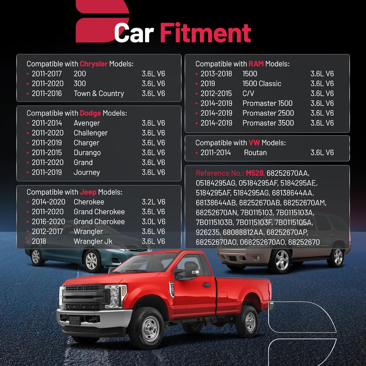 [Fitment]: The engine oil pumps compatible with Chrysler 200 2011-2017/300 2011-2020/Town & Country 2011-2016 3.6L; compatible with Dodge Avenger 2011-2014, Challenger 2011-2020, Charger 2011-2019, Durango 2011-2015, Grand 2011-2020, Journey 2011-2019 3.6L; compatible with Jeep Cherokee 2014-2020 3.2L, Grand Cherokee 2016-2020 3.0L/2011-2020 3.6L, Wrangler 2012-2017 3.6L, Wrangler JK 2018 3.6L; Ram 1500 2013-2018/1500 Classic 2019, C/V 2012-2015, Promaster 1500 2500 3500 2014-2019 3.6L; Vw Routan 2011-2014 3.6L