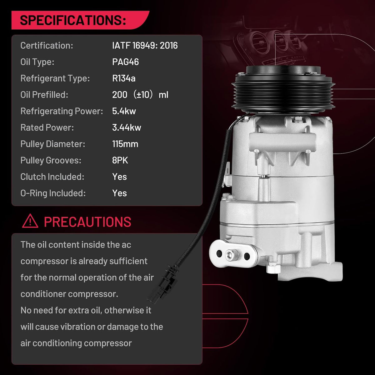 Easy Installation - The Air Conditioning A/C Compressors come pre-charged with PAG oil for R134a applications, come with the R134A required o-rings /sealing washers and direct fit connectors for ease of installation