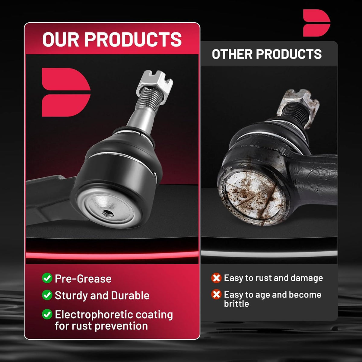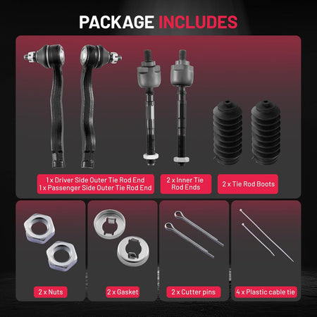 Tie Rod Ends Kit Include:2 x EV367 Front Inner Tie Rod Ends, 1 x ES3332 Front Driver Side Outer Tie Rod End, 1 x ES3331 Front Passenger Side Outer Tie Rod End, 2 x Tie Rod Boots, 2 x Cutter pins, 2 x Gaskets, 2 x Nuts, 4 x Plastic cable tie.