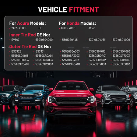 OE Standard Performance:Exquisite craftsmanship design,100% brand new high quality auto parts, OE grade durability, bring you ultimate comfortable driving experience.Inner Tie Rod OE No.:EV367, 53010S04000, 53010S04J5, 53010S04J51, 53010SO4000. Outer Tie Rod OE No.:ES3332, ES3331, 53560S04003, 53560S04013, 53560SO4003, 53560SO4013, 53560SR0A01, 53560SR3003, 53560SROAO1, 53560ST7003, 53560TF0003, 53540S04003, 53540S04013, 53540SO3003, 53540SO3013, 53540SR0A01, 53540SR3003, 53540SROAO1.