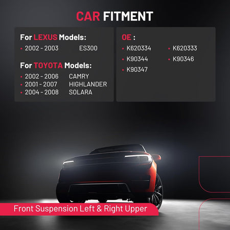 【Compatible with】 Compatible with Lexus ES300 2002-2003; Compatible with Lexus ES330 2004-2006; Compatible with Lexus RX330 2004-2006 (without Air Suspension); Compatible with Lexus RX350 2007-2009 (without Air Suspension); Compatible with Lexus RX400h 2006-2008; Compatible with Toyota Camry 2002-2006; Compatible with Toyota Highlander 2001-2007; Compatible with Toyota Solara 2004-2008