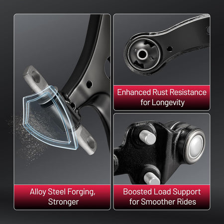 【Control Arm Features】 The control arm improves stability, handling, and driving comfort, with a protective finish that helps extend service life. Made from forged alloy steel, it delivers reliable performance, reduces noise, and ensures accurate fitment for safe and consistent driving