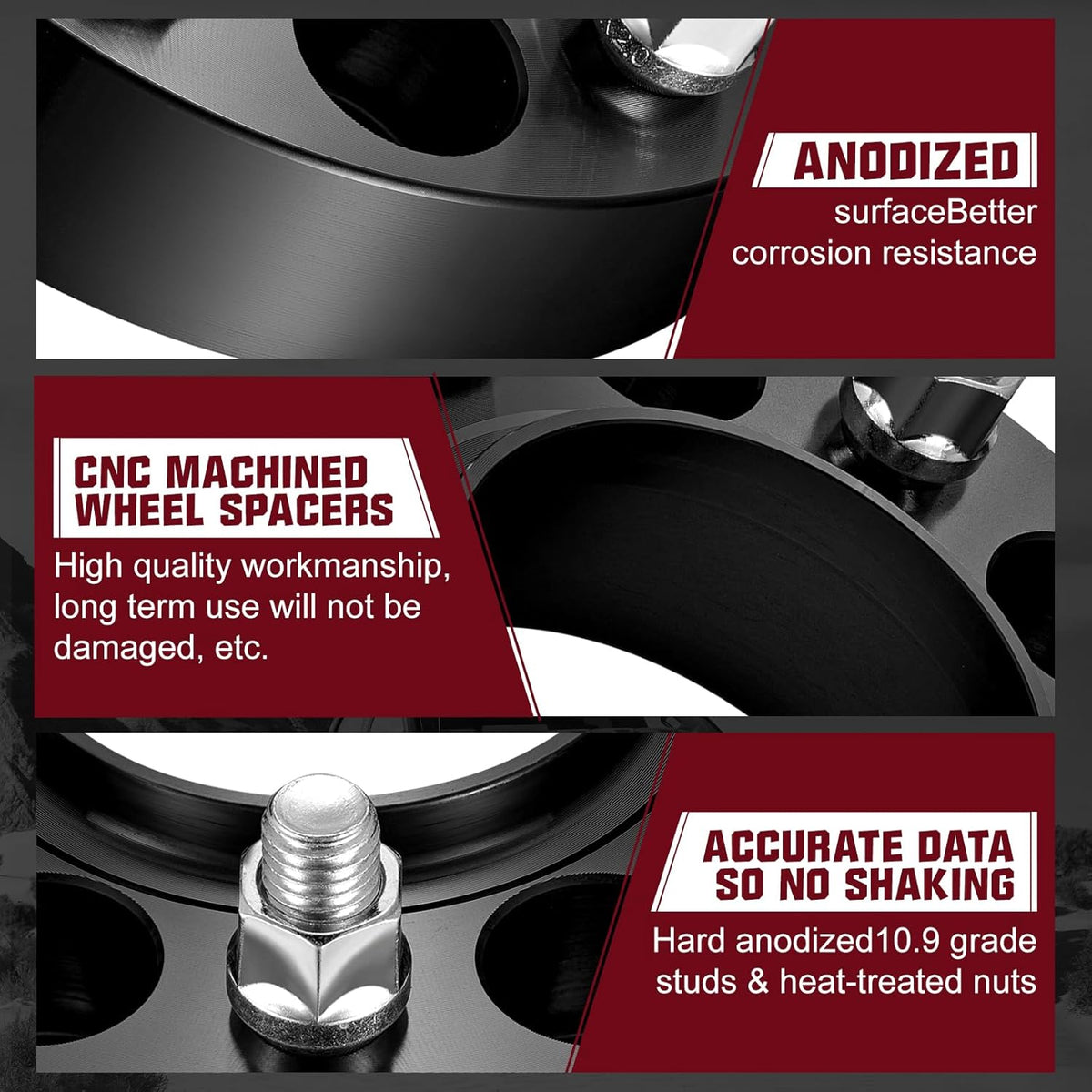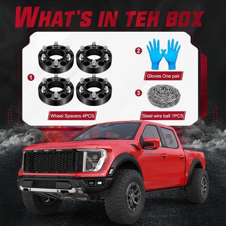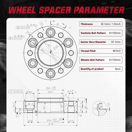 【Product Specs:】Set of 4 1.5inch /38.1mm Thickness | 6x135mm Wheel Bolt Pattern | 87.1mm Center Bore | M14x2 Thread Pitch | Protective gloves| Cleaning wire balls.
