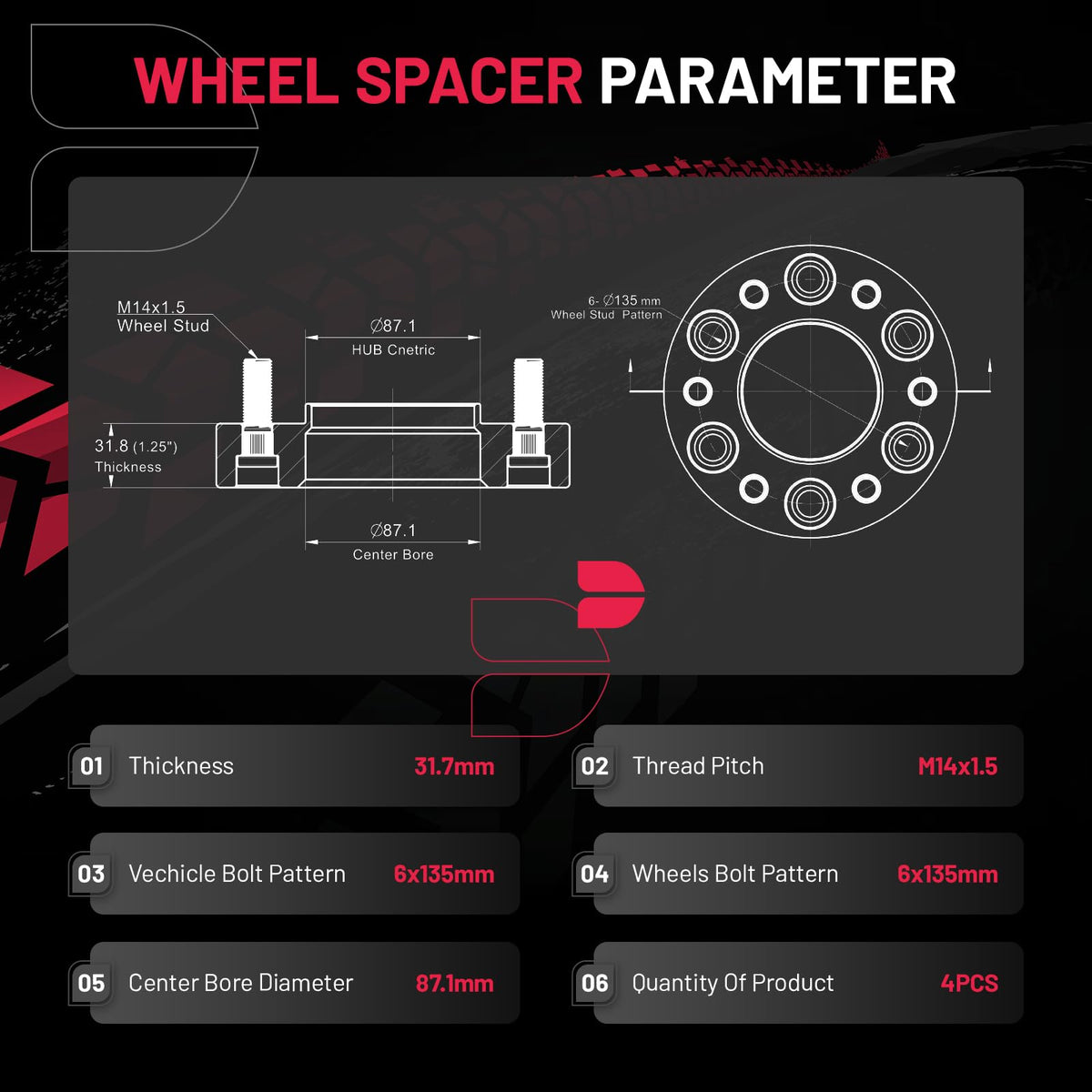 - 【Product Specs:】Set of 4 1.25 inch/32 mm Thickness | 6x135mm Wheel Bolt Pattern | 87.1mm Center Bore | M14x1.5 Thread Pitch | Protective gloves| Cleaning wire balls.