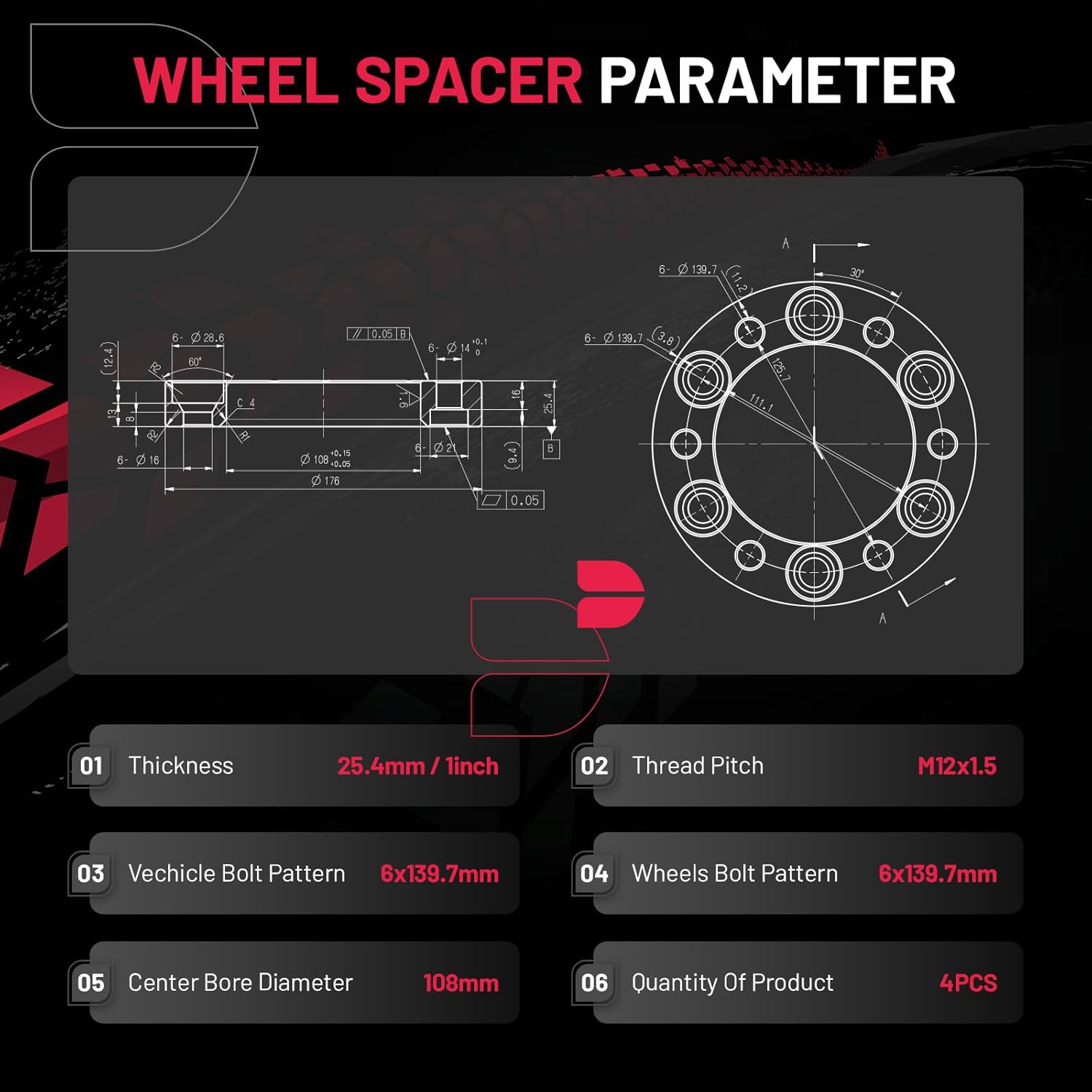 Product Specs: Set of 4 1 inch/25.4 mm Thickness, 6x139.7mm Wheel Bolt Pattern, 108mm Center Bore, Thread Pitch M12x1.5 (without lip hub). Protective gloves, Cleaning wire balls. Not hubcentric. Please check detail fitting info from pics or detail page. 12 months warranty and lifetime after-sales service are furnished after bought our products. Please choose a suitable one with confidence
