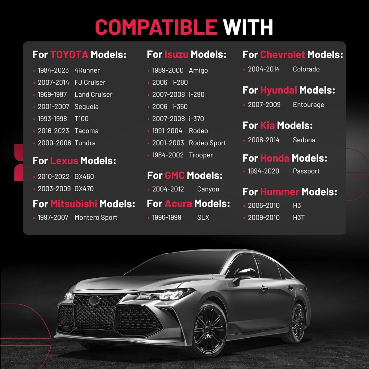 Basic Info: Wheel Spacers Compatible with Acura 1996-1999 SLX, Compatible with Toyota 1984-2023 4Runner, 2007-2014 FJ Cruiser, 1969-1997 Land Cruiser,2001-2007 Sequoia, 1993-1998 T100, 2016-2023 Tacoma, 2000-2006 Tundra, Compatible with Lexus 2010-2022 GX460, 2003-2009 GX470, Compatible with Hyundai 2007-2009 Entourage, Compatible with Isuzu 1989-2000 Amigo, 2006 i-280, 2007-2008 i-290, 2006 i-350, 2007-2008 i-370, 1991-2004 Rodeo, 2001-2003 Rodeo Sport, 1984-2002 Trooper, Compatible with Chevy 2004-2014 Colorado, Compatible with GMC 2004-2012 Canyon, Compatible with Honda 1994-2020 Passport, Compatible with Hummer 2006-2010 H3, 2009-2010 H3T, Compatible with Kia 2006-2014 Sedona