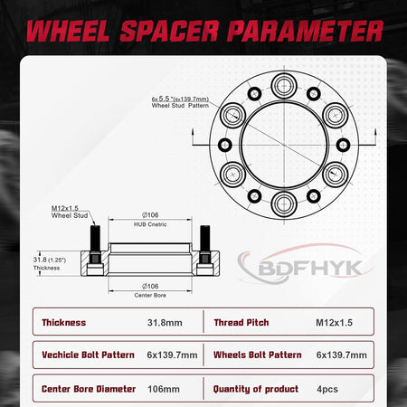 【Product Specs:】1.25 inch/32 mm Thickness | 6x139.5 mm Wheel Bolt Pattern | 106 mm Center Bore | M12x1.5 Thread Pitch | Protective gloves| Cleaning wire balls.