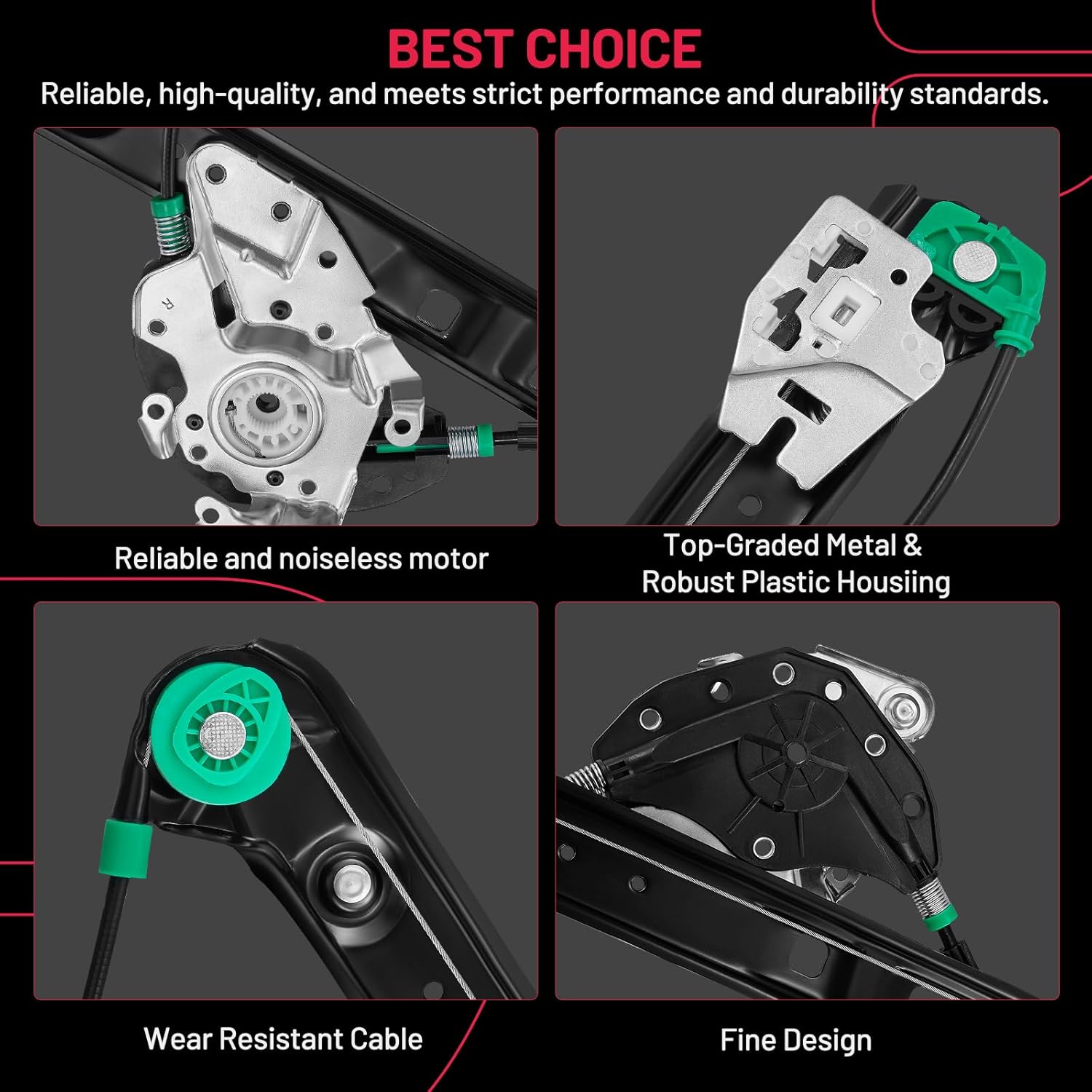【Premium Quality】 This window regulator and motor assembly feature significant enhancements over the factory part, providing a higher level of reliability. It incorporates tension springs to effectively resist cable reel binding caused by prolonged use. Additionally, it is equipped with advanced cable guides to eliminate high cable tension and reduce cable stress.