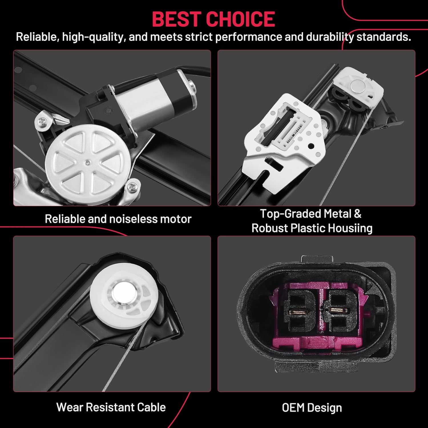 【Premium Quality】 This window regulator and motor assembly feature significant enhancements over the factory part, providing a higher level of reliability. It incorporates tension springs to effectively resist cable reel binding caused by prolonged use. Additionally, it is equipped with advanced cable guides to eliminate high cable tension and reduce cable stress.