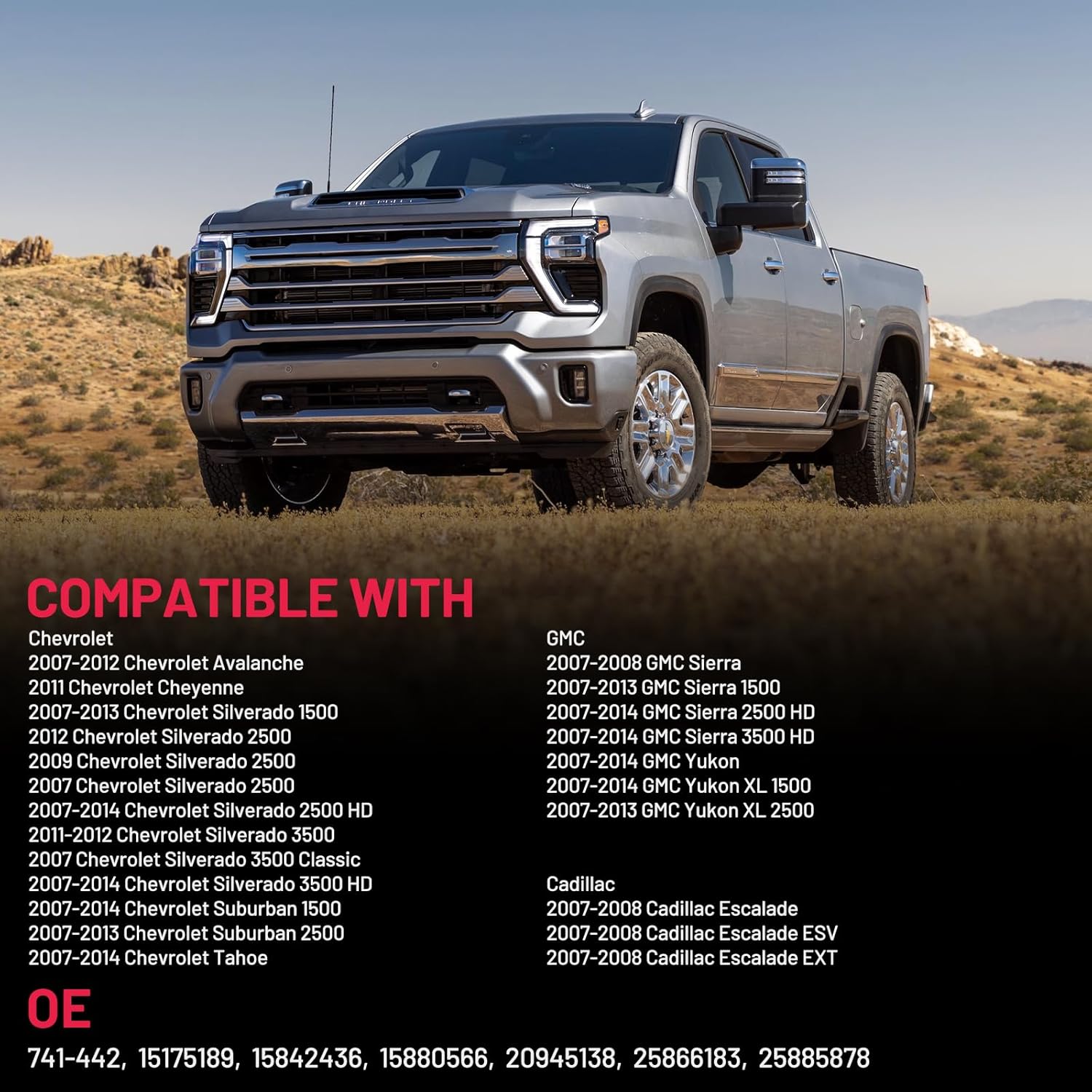 【Fitment】Compatible with Cadillac Escalade/Escalade ESV/Escalade EXT 2007-2008; Compatible with Chevy Avalanche 2007-2012, Cheyenne 2011, Silverado 1500 2007-2013, Silverado 2500 2007&2009&2012, Silverado 3500 2011-2012, Silverado 3500 Classic 2007, Silverado 2500 HD/Silverado 3500 HD/Suburban 1500/Tahoe 2007-2014, Suburban 2500 2007-2013; Compatible with GMC Sierra 2007-2008, Sierra 1500/Yukon XL 2500 2007-2013, Sierra 2500 HD/Sierra 3500 HD/Yukon/Yukon XL 1500 2007-2014
