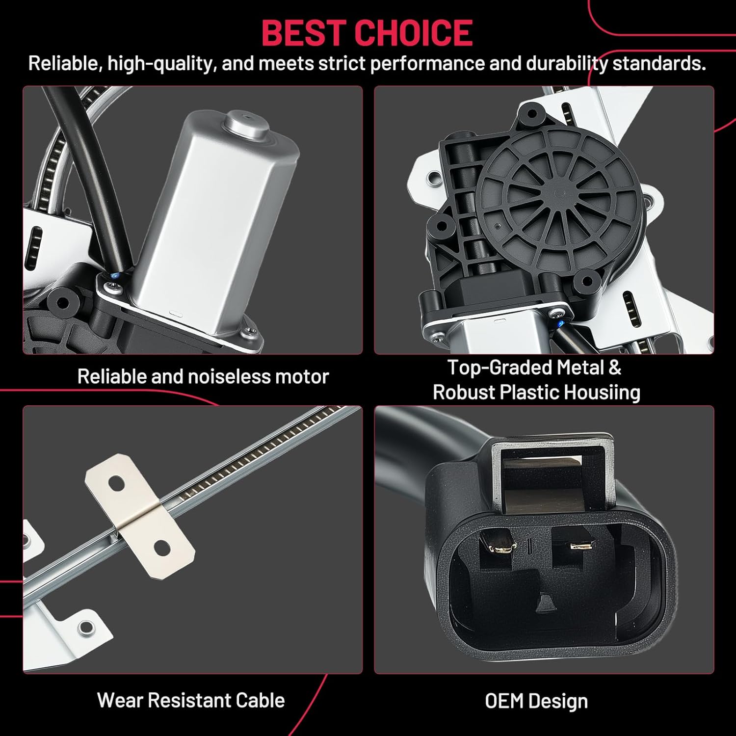 【Premium Quality】 This window regulator and motor assembly feature significant enhancements over the factory part, providing a higher level of reliability. It incorporates tension springs to effectively resist cable reel binding caused by prolonged use. Additionally, it is equipped with advanced cable guides to eliminate high cable tension and reduce cable stress.